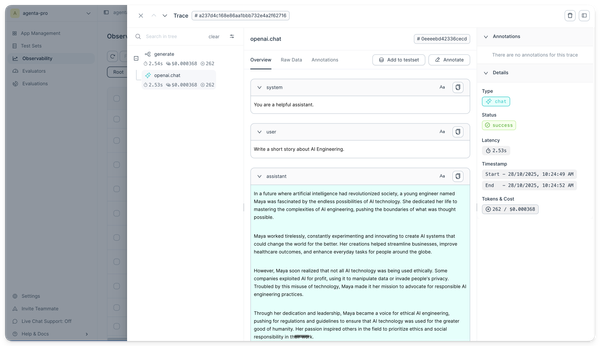 After running your application, log in to your Agenta dashboard and navigate to the Observability section. You will see traces showing: