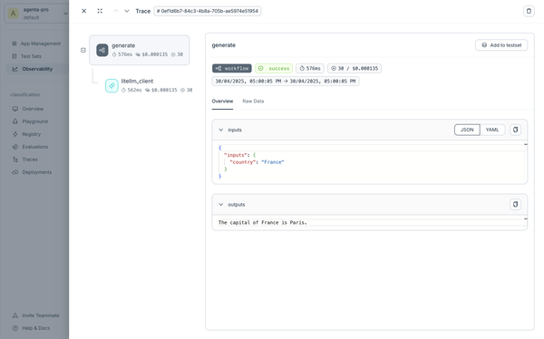 All proxy calls are automatically traced and can be viewed in the observability dashboard: